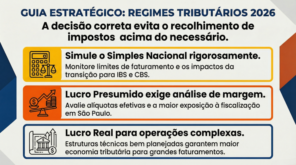 | Regime tributário | Escolha simplificada | Análise técnica obrigatória |